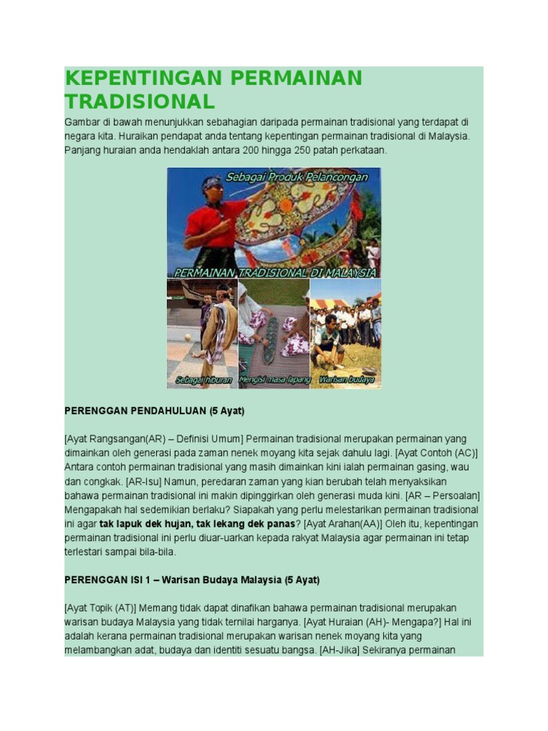 Karangan Permainan Tradisional Spm : Permainan tradisional mempunyai keunikannya yang tersendiri dan merupakan warisan budaya bangsa malaysia.. Sebagai individu, adakah kita sanggup membiarkan khazanah budaya bangsa kita lenyap begitu sahaja dek peredaran zaman yang berlaku? Contoh karangan a spm 2010. Karangan spm perlu dikuasai oleh semua murid yang mengambil spm kerana ini merupakan mata pelajaran yang wajib lulus. 91 downloads 709 views 149kb size. Kemungkinan anak sekarang tidak banyak yang tahu apa dan bagaimana cara memainkan.