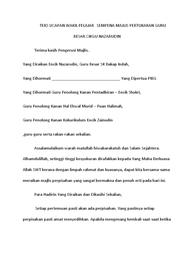 Teks ucapan persaraan tn hj badaruddin hj dahlan. Teks ucapan wakil pelajar sempena majlis pertukaran guru besar cikgu nazarudin terima kasih pengerusi majlis. Dijemput dengan sukacitanya saudari nurul aisyah binti yahya wakil pelajar untuk menyampaikan ucapan. Assalamualaikum w.r.b.t dan selamat pagi. Teks ucapan ketua pelajar sempena hari guru.