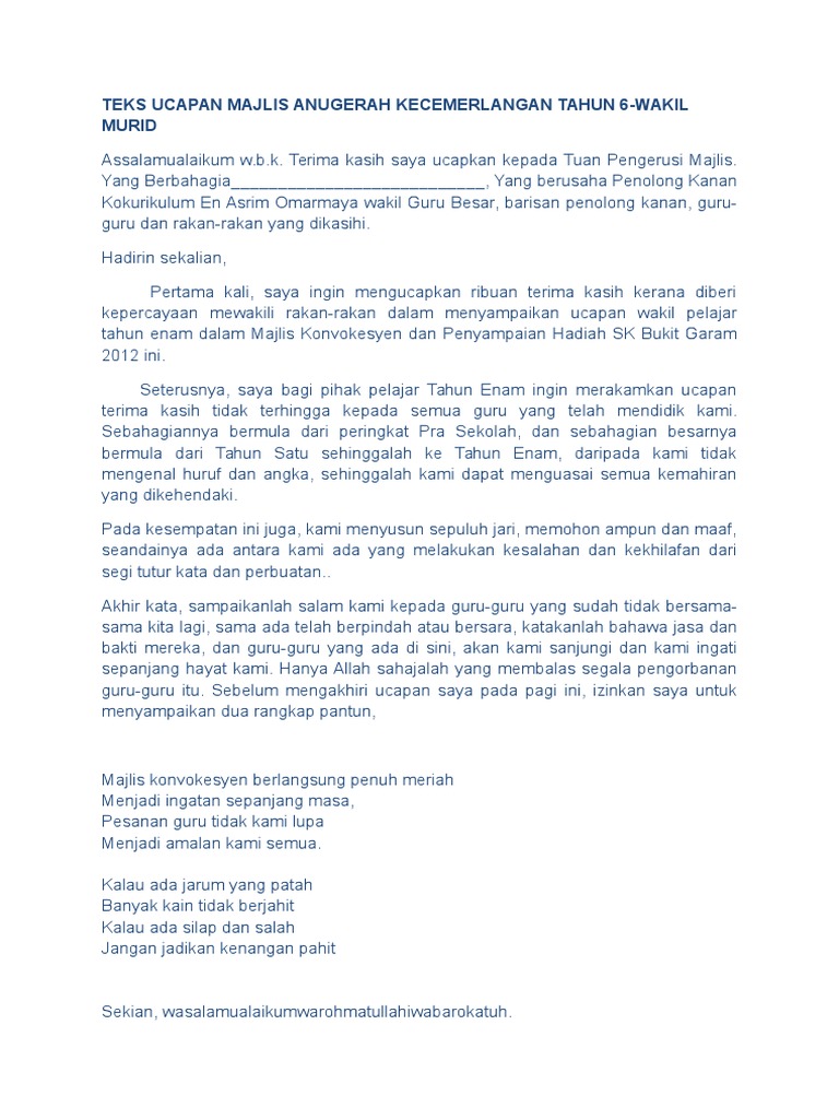 Teks Ucapan Majlis Anugerah Kecemerlangan Tahun 6 from imgv2-1-f.scribdassets.com Teks ucapan ringkas perpisahan pertukaran tempat kerja. Teks ucapan pengerusi majlis perasmian perkhemahan unit beruniform 20. Maktab rendah sains mara tun ghafar baba tarikh: Mc speech english day launching linda ahmad. Teks ucapan in english cognition psychology. Saudara fahmi hazim bin fayahet menyampaikan ucapan wakalah pelajar semasa majlis graduasi smk seri kenangan, segamat, johor (sekolah kluster kecemerlangan). Kesempatan pada pagi ini merupakan suatu detik bersejarah bagi diri saya kerana dapat menyampaikan ucapan sebagai wakil pelajar dalam majlis pelerahan ilmu ini. Assalamualaikaum dan selamat sejahtera, (baca basmallah dan selawat nabi).