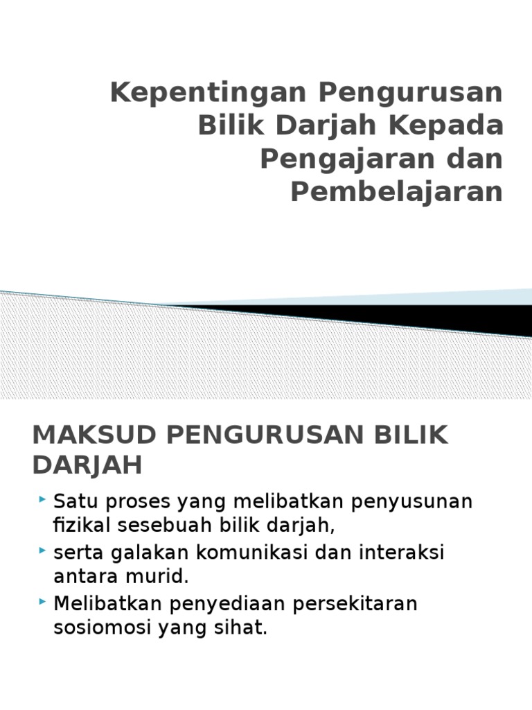 Pengurusan bilik darjah dan tingkah laku. 1 maksud pengurusan bilik darjah. Pengurusan bilik darjah pada umumnya bertujuan mewujudkan keadaan, suasana, dan persekitaran pembelajaran yang kondusif. Jika seseorang guru berjaya mengurus bilik darjah dengan sempurna, maka proses pengajaran dan pembelajaran (pdp) boleh ditafsirkan sebagai berjaya. ''mentransformasikan bilik darjah dengan ruang pembelajaran kreatif hasil usaha murid supaya menarik dan bermakna.