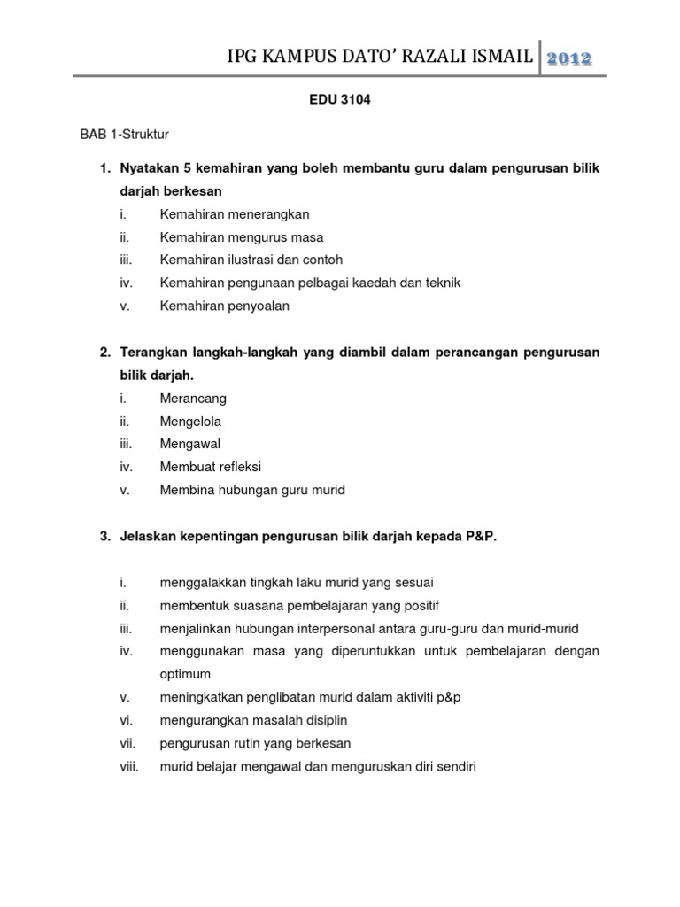 Nota ringkas subjek pengurusan bilik darjah & tingkah laku (edu 3104) dari guru pelatih pismp kajian sosial sem 3/2012 dari ipg. Pengurusan bilik darjah merupakan perkara yang penting perlu diketahui bagi seseorang guru, tanpa ilmu untuk mengurus bilik darjah, sesi pengajaran dan pembelajaran tidak dapat dijalankan dengan baik. ''mentransformasikan bilik darjah dengan ruang pembelajaran kreatif hasil usaha murid supaya menarik dan bermakna. melibatkan penyediaan persekitaran sosiomosi yang sihat. Pelaksanaan program/aktiviti, dimensi pengurusan pengurusan bilik darjah prasekolah yang berkesan ?.