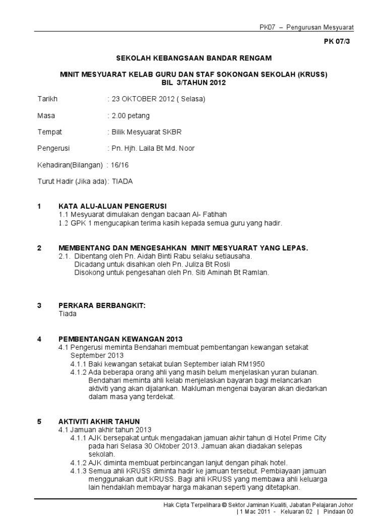 Doc Minit Mesyuarat Kokurikulum Maya Diana Academia Edu from 0.academia-photos.com Mesyuarat guru dan kakitangan bil. Mesyuarat dimaklumkan bahawa kemerosotan pencapaian mata pelajaran matematik, sains dan bahasa inggeris bagi kelas 3 rozel, 3 citrus dan 3 tulip adalah disebabkan sikap murid yang mempengaruhi keputusan ujian tersebut, iaitu tidak mahu membuat latihan yang diberi, kurang sopan terhadap guru, tidak minat untuk belajar, tidur semasa sesi pembelajaran dan pengajaran, ponteng sekolah dan. Catatan perbincangan catatan minit mesyuarat hendaklah direkodkan secara padat, tepat dan jelas. Bilik gerakan skkk1 kehadiran : Selain itu, pastikan bahagian tandatangan selengkapnya pada satu helaian muka surat contohnya bahagian disahkan oleh, dengan nama orang yang berkenaan beserta jawatannya bukan pada helaian muka surat. Minit mesyuarat atau minutes of meeting (mom) merupakan satu rekod pembentangan wajib untuk sesebuah mesyuarat dan ianya amat penting sebagai panduan kepada semua pihak seperti guru, staf atau pekerja mahupun individu luar yang hadir atau tidak hadir mesyuarat bagi mengetahui hasil perbincangan mesyuarat tersebut. Terima kasih atas usaha semua sepanjang tahun 2017 dan tahniah atas pencapaian cemerlang dalam pelbagai bidang akademik, kokurikulum dan sahsiah. Bahan tugasan guru akhir tahun 2020.