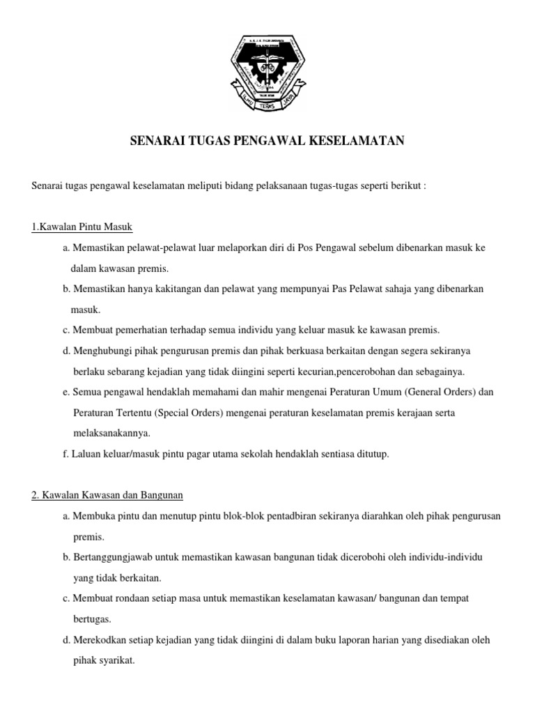 Memastikan butiran kenderaan awam dicatat. Apakah tugas seorang pegawai keselamatan? Tugas pengawal keselamatan syif no sekuriti & lokasi tugas / diskripsi kerja siang 1&2: Menyediakan pelan tindakan kontigensi bagi menghadapi krisis dan bencana alam. Penggunaan skop sop sop ini digunakan bagi menentukan pelan tindakan ketika kecemasan / bencana dilaksanakan secara jelas, seragam, terancang dan memenuhi segala prosedur. Mpu3113 contoh latihan untuk mempertahankan diri, pengunaan cctv, dan latihan mengenai perundangan. Tugas utama jawatankuasa ini ialah memantau keperluan keselamatan di sekolah yang bertujuan untuk mengenalpasti masalah, mencadang program/polisi sekolah selamat dan membantu dalam mengurusan sebelum dan selepas krisis berlaku. Merancang pembangunan dan penyelenggaraan sekolah sekali setahun sebelum 31 julai pada setiap tahun. Pengawal keselamatan, polis bantuan and more on indeed.com 1) tatacara am pengawal keselamatan. Ianya bertujuan untuk meningkatkan pengetahuan untuk menjalankan tugas, professionalisma, ketrampilan diri, keyakinan diri dan perasaan lebih bertanggungjawab semasa menjalankan tugas dan peranan mereka. Pengawal keselamatan jobs now available. Taklimat kontrak perkhidmatan kawalan keselamatan daerah port dickson.